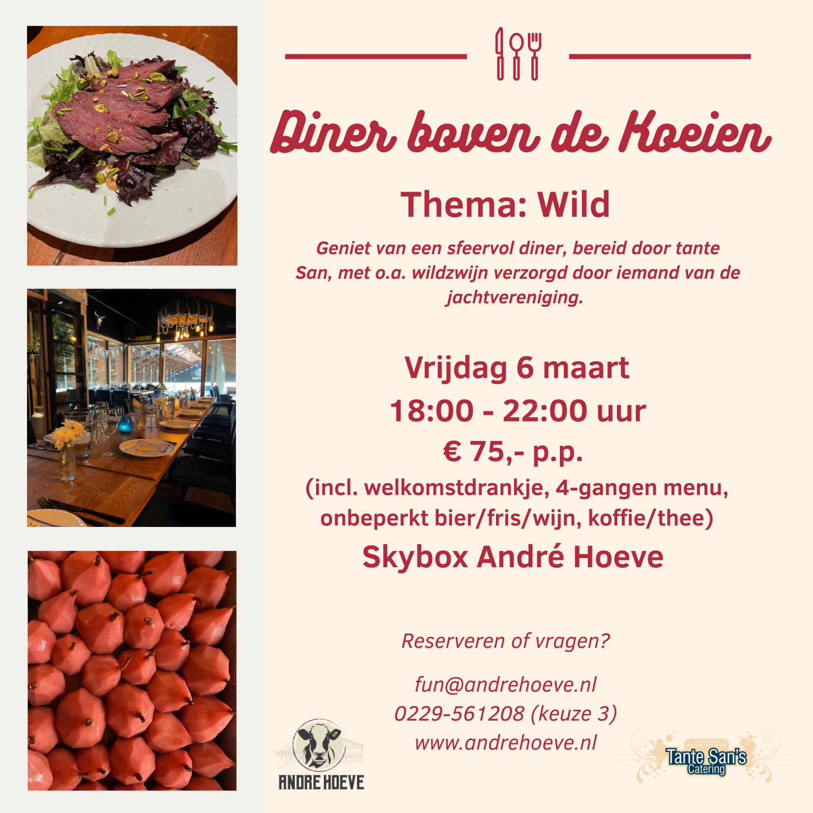 - € 75,- per persoon (incl. welkomstdrankje, onbeperkt bier/fris/wijn, 4-gangen menu afgestemd op thema, koffie/thee, boerderijbeleving en uitleg André Hoeve)