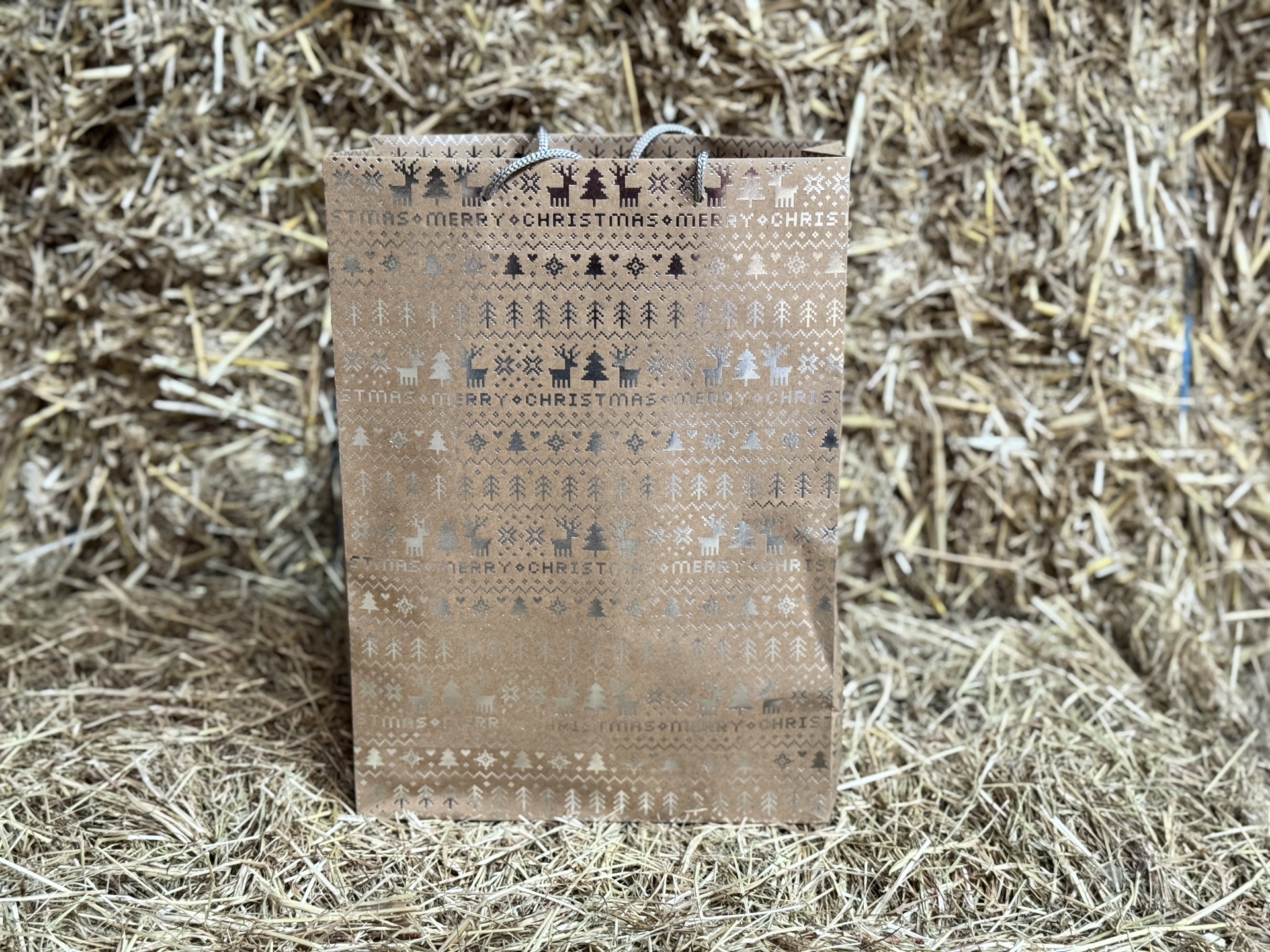 - Kartonnen kersttas verpakt met feestelijke kerstlinten.
